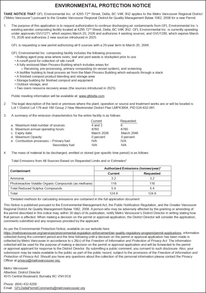 Check back soon for information on GFL Delta’s environmental protection notice. Date, time, venue, and location information will be provided soon.